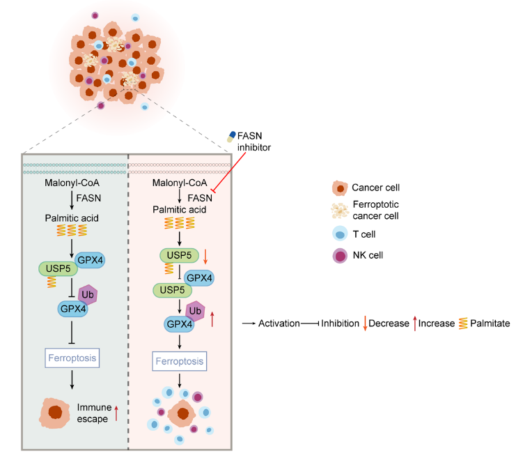 脂肪代谢紊乱是乳腺癌的一个独立风险因素,铁死亡是一种新型的程序性细胞死亡形式,其特点是谷胱甘肽(GSH)耗竭以及抗氧化系统核心调控因子谷胱甘肽过氧化物酶4(GPX4)的失活。虽然脂肪酸代谢与铁死亡之间的密切关联已在多种疾病中得到研究,但FASN与铁死亡之间的相互作用仍未被探索。本研究证实FASN的表达与乳腺癌中免疫“冷”肿瘤微环境呈正相关,敲低FASN会通过促进GPX4降解诱导铁死亡,从而增强抗程序性细胞死亡蛋白1(PD-1)免疫疗法的疗效。免疫共沉淀结合质谱分析(IP/MS)及Co-IP实验表明,去泛素化酶5(USP5)通过与GPX4结合并去泛素化来稳定GPX4。此外,敲低FASN会抑制USP5的棕榈酰化,削弱其与GPX4的相互作用,进而增加GPX4的泛素化和降解。FASN通过USP5介导GPX4蛋白稳定性调控,从而抑制乳腺癌中的铁死亡,体内外靶向FASN均可以有效抑制乳腺癌发生,本研究为乳腺癌的肿瘤免疫治疗增敏提供了方向和靶点。